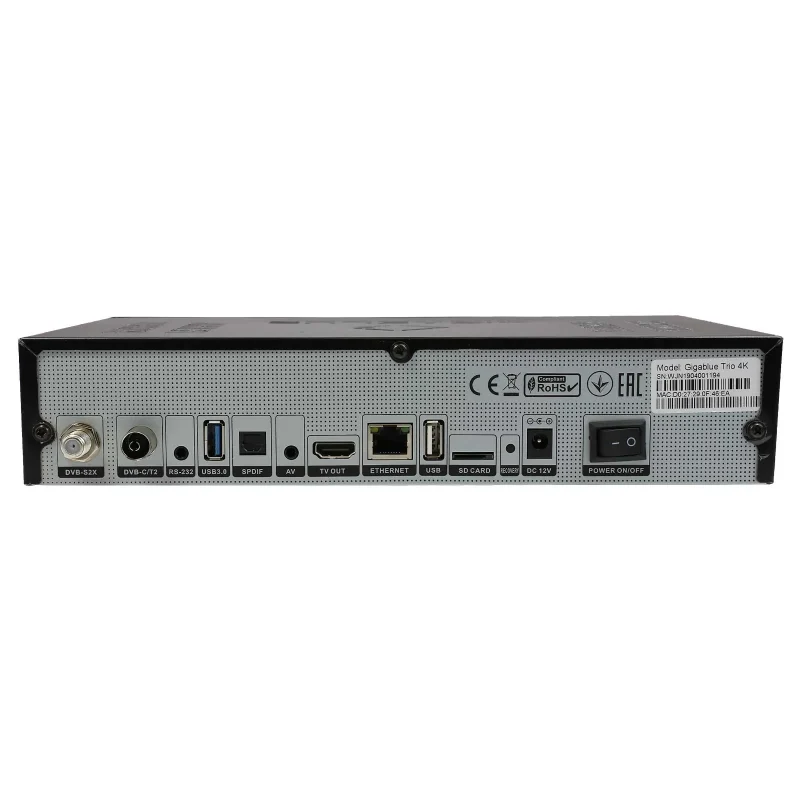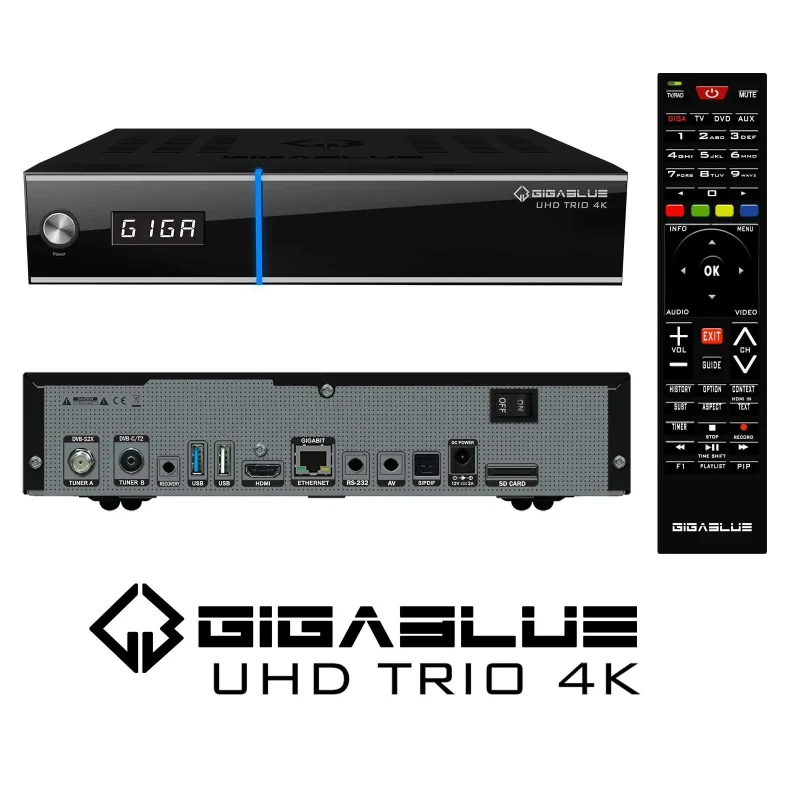 GigaBlue ha donato un chipset Hisilicon 3798MV200 al suo nuovo ricevitore combinato 4K / UHD. È un processore quad core ARM Cortex A53 installato e 8 gigabyte di memoria flash eMMC. Grazie all’hardware utilizzato, il GigaBlue UHD Trio 4K insieme alla DDR3 SDRAM da 1 gigabyte arriva a un output totale di 15.000 DMIPS. Brevi tempi di avvio, tempi di commutazione fissi, rendering regolare e navigazione rapida nei menu di GigaBlue UHD Trio 4K sono garantiti.