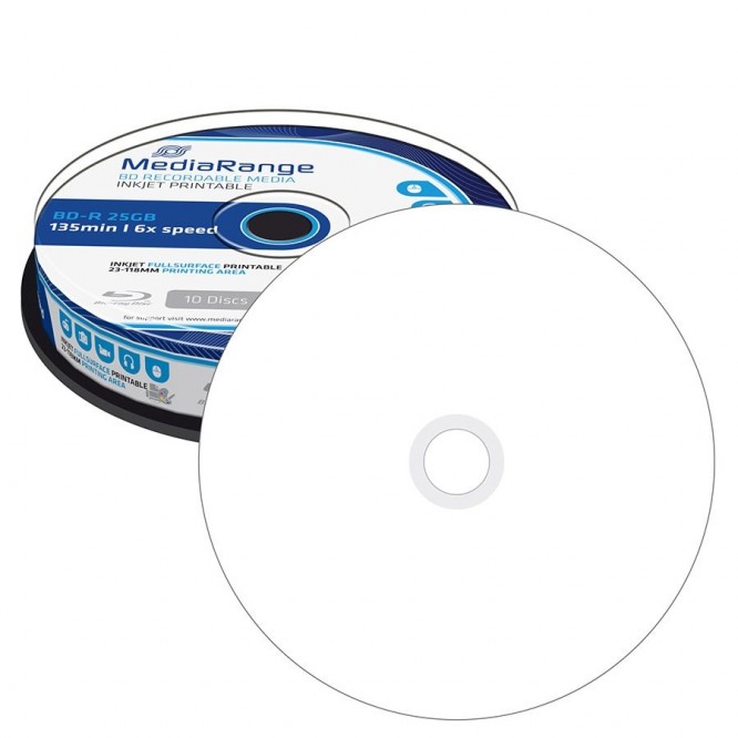 MediaRange 10 Blu Ray BD-R HTL Full Surface Printable 25GB 135 MIN 6X – MR500
